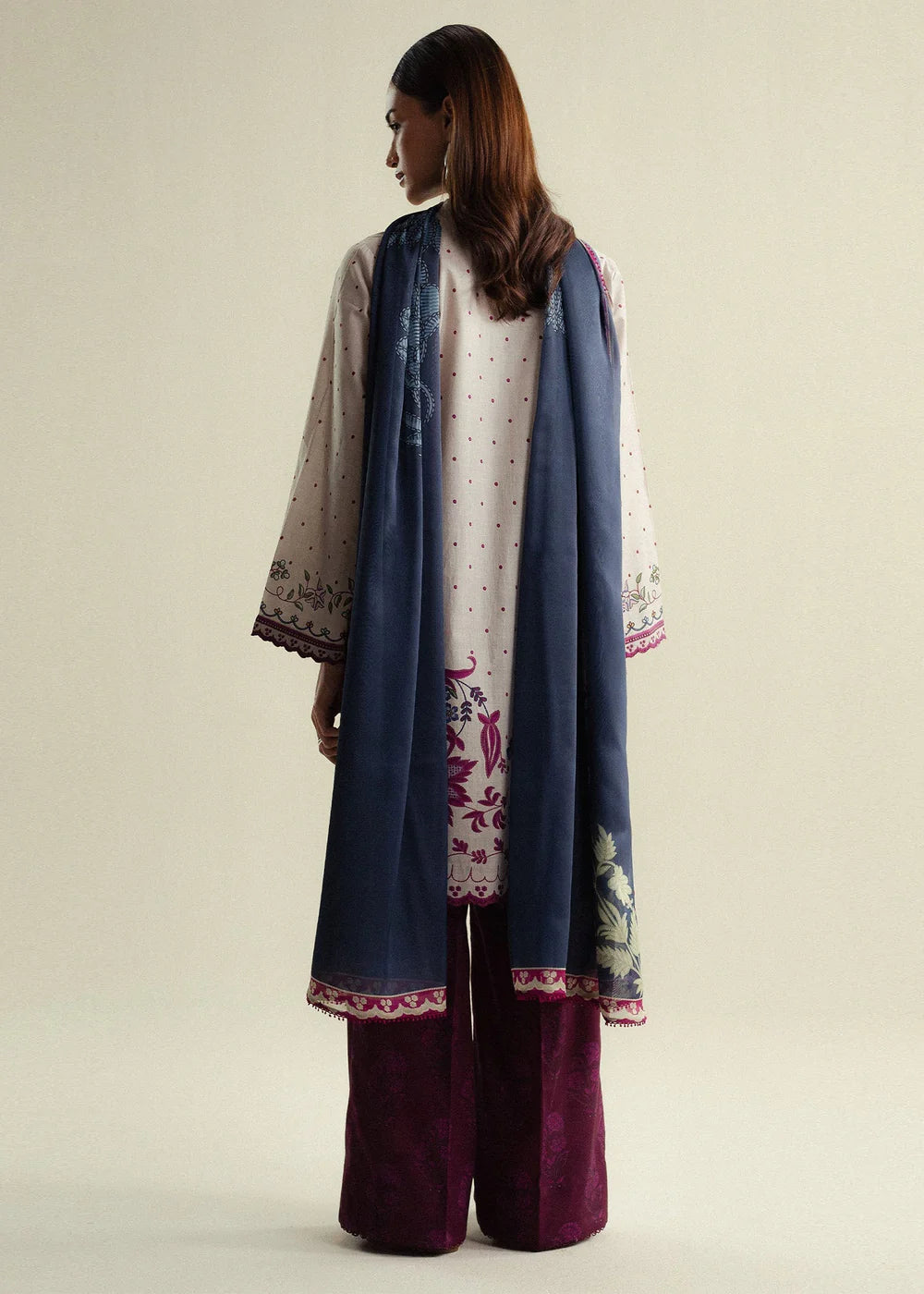 A sand ivory shirt enhanced with intricate plum embroidery, paired with a printed trouser and a blue dupatta that brings a cool, contemporary edge. Digital Printed Silk Dupatta 2.5 Mtrs Digital Printed Slub Cotton Shirt 3 Mtrs Digital Printed Cambric Trouser 2.4 Mtrs